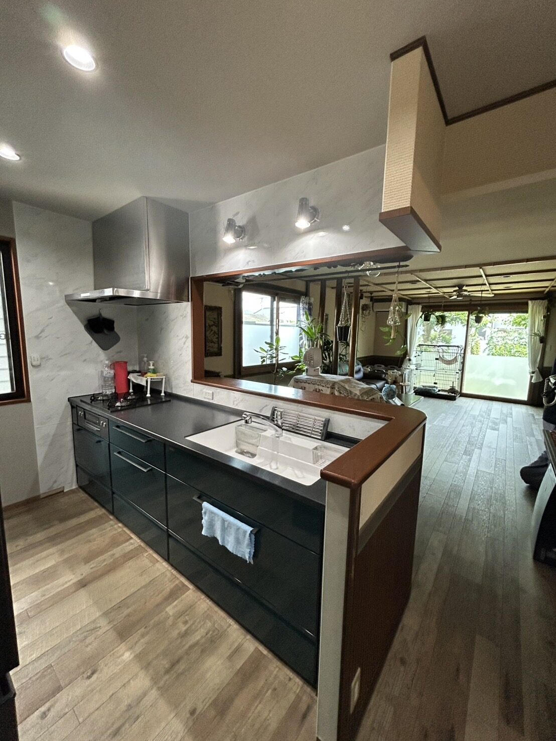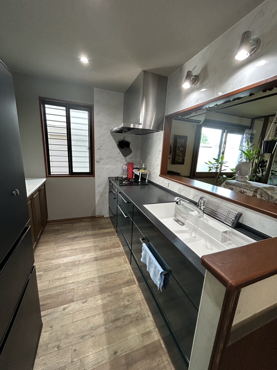 黒系のキッチン扉やフローリングの木目との相性も良く、モダンで落ち着いたキッチンスペースへと生まれ変わりました。