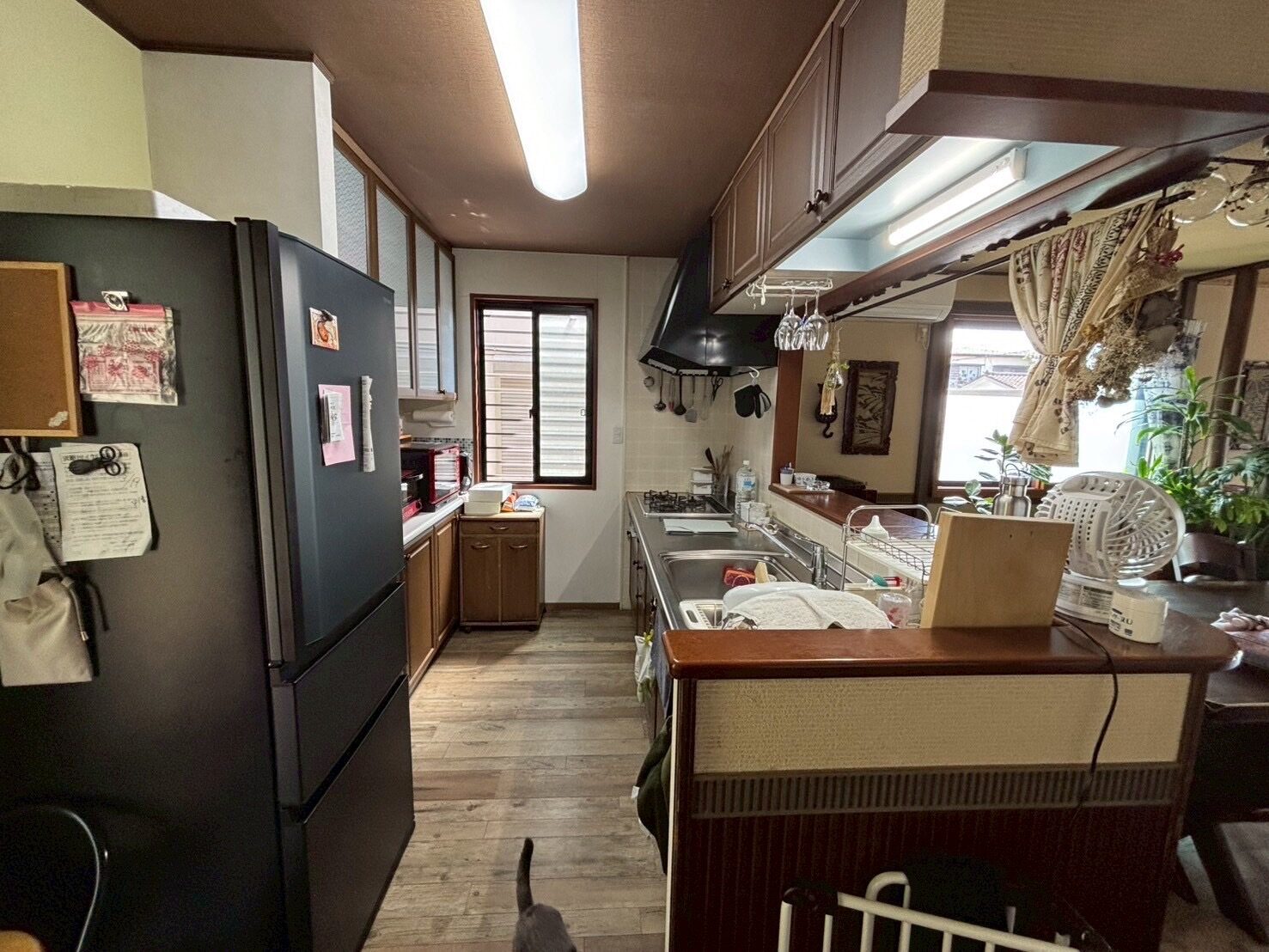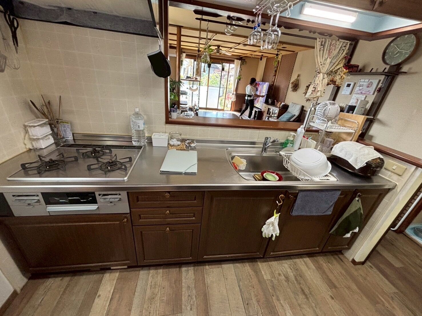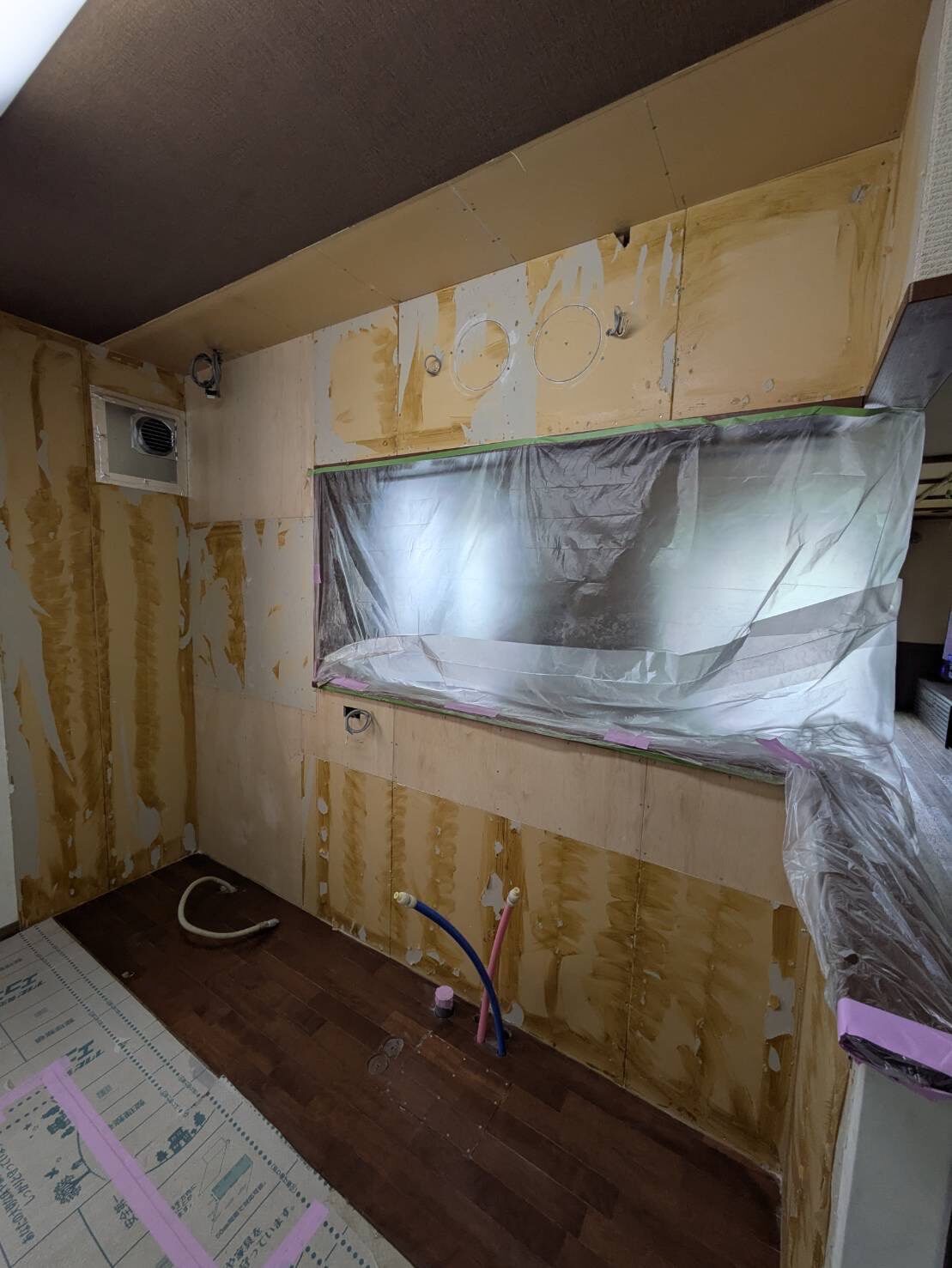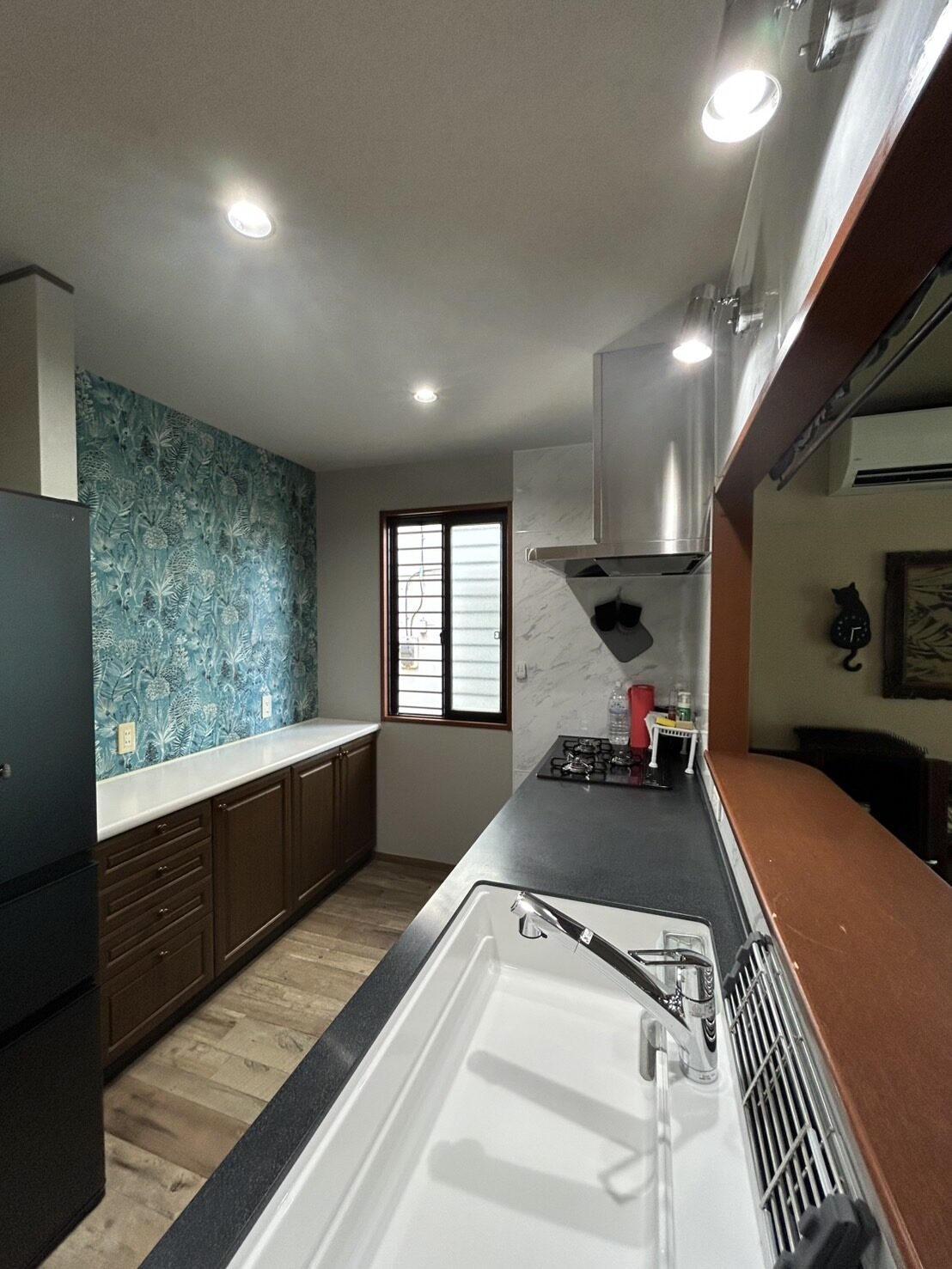 今回の工事では、既存のカップボードはそのままに、上部の吊り戸を解体し、壁面にはアクセントクロスを施工。キッチン空間に抜け感とデザイン性を持たせ、よりすっきりとした印象に仕上げました。