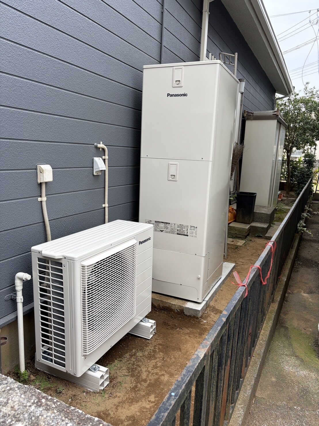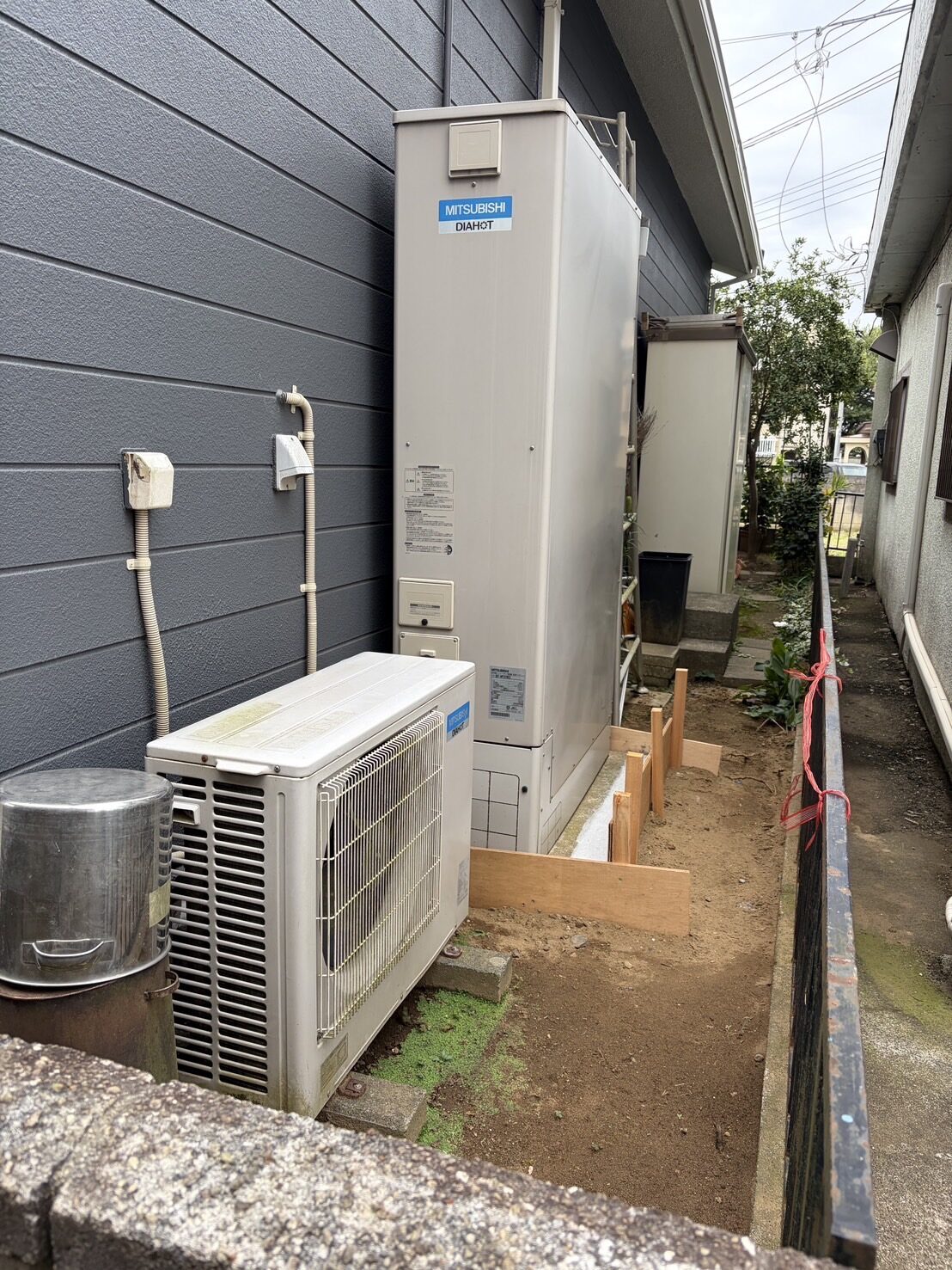 もともとスリムタイプのエコキュートをご使用されていたお客様からのご依頼でした。今回は敷地内のスペースに余裕があったため、通常タイプのエコキュートをご提案いたしました。