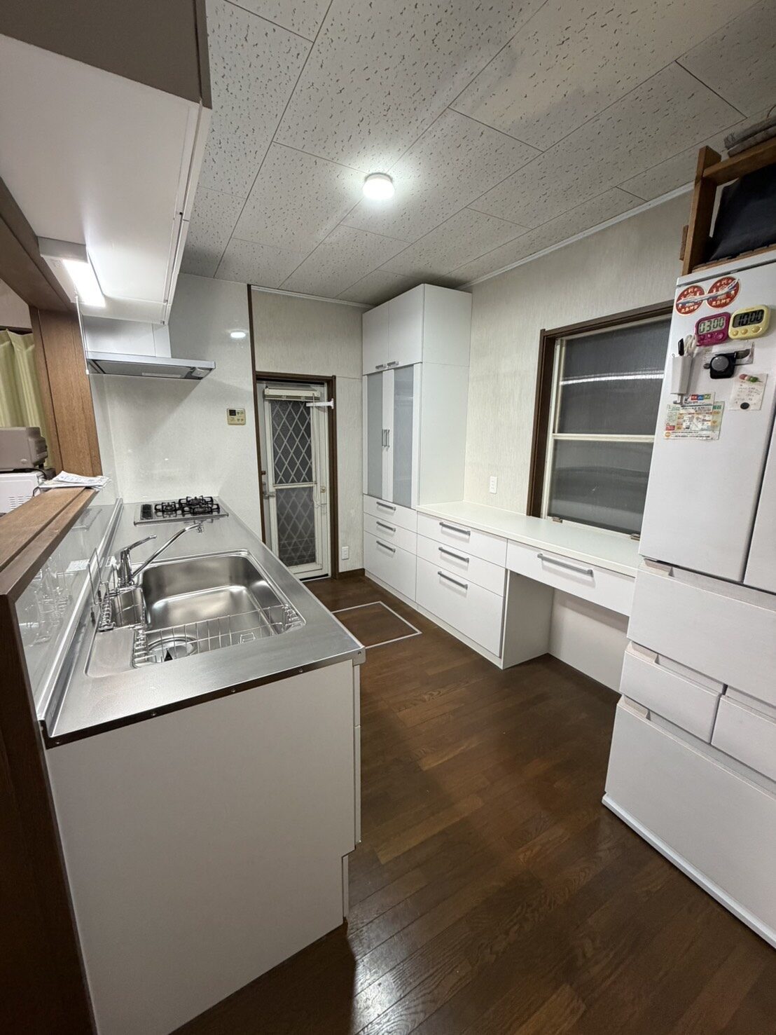 工事当日は、建物の経年による傾きの影響で水平を取るのが難しく、組み付けに工夫が必要な場面もありました。しかし施工スタッフが丁寧に調整を重ね、美しい仕上がりを実現。清潔感あふれる真っ白いキッチンが完成し、お客様にお引き渡しとなりました。工事期間は3日間で無事に完了いたしました。