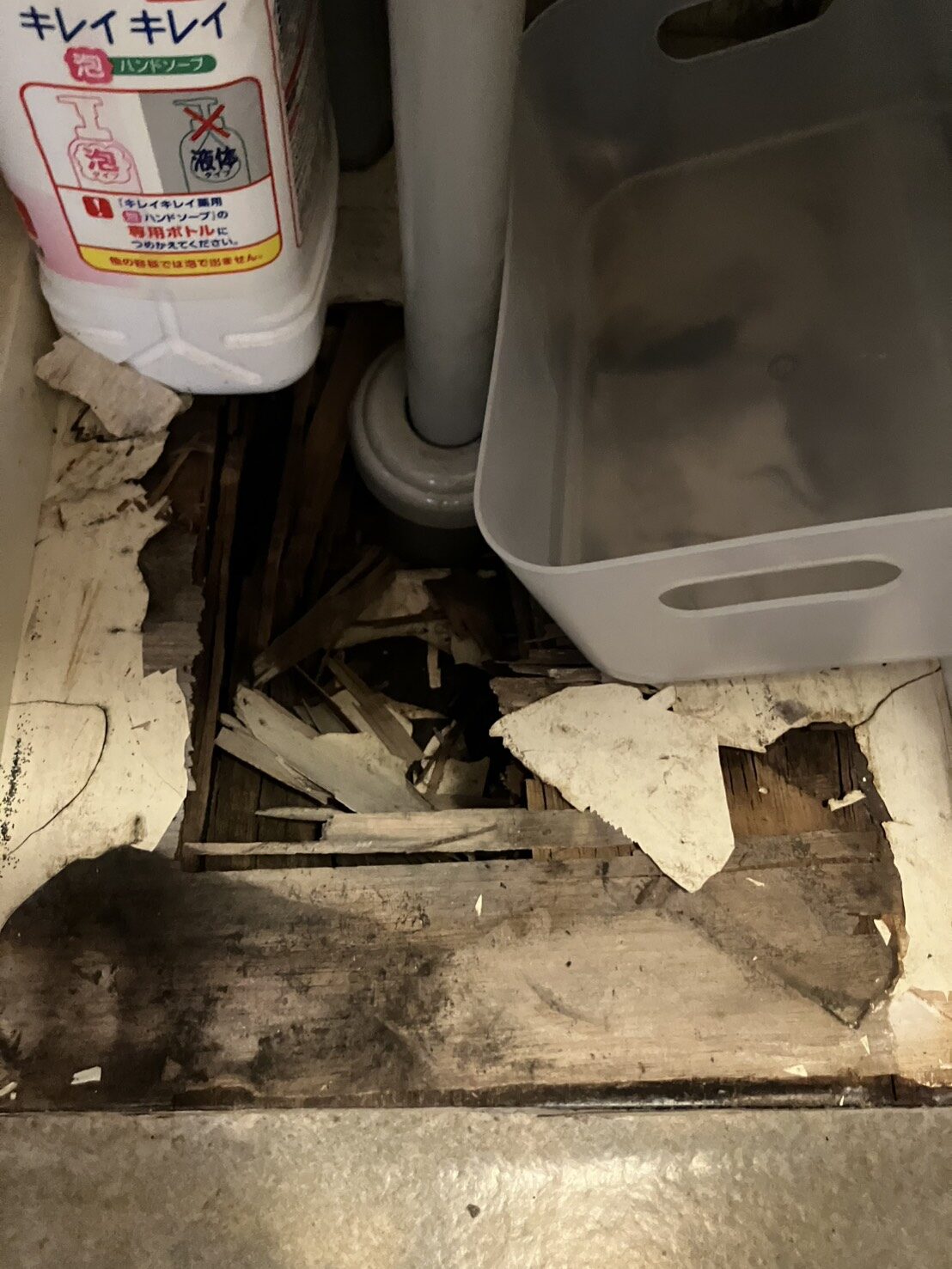 洗面台の排水から水が漏れてしまい、脱衣場の床が抜けてしまったとのご相談をいただきました。