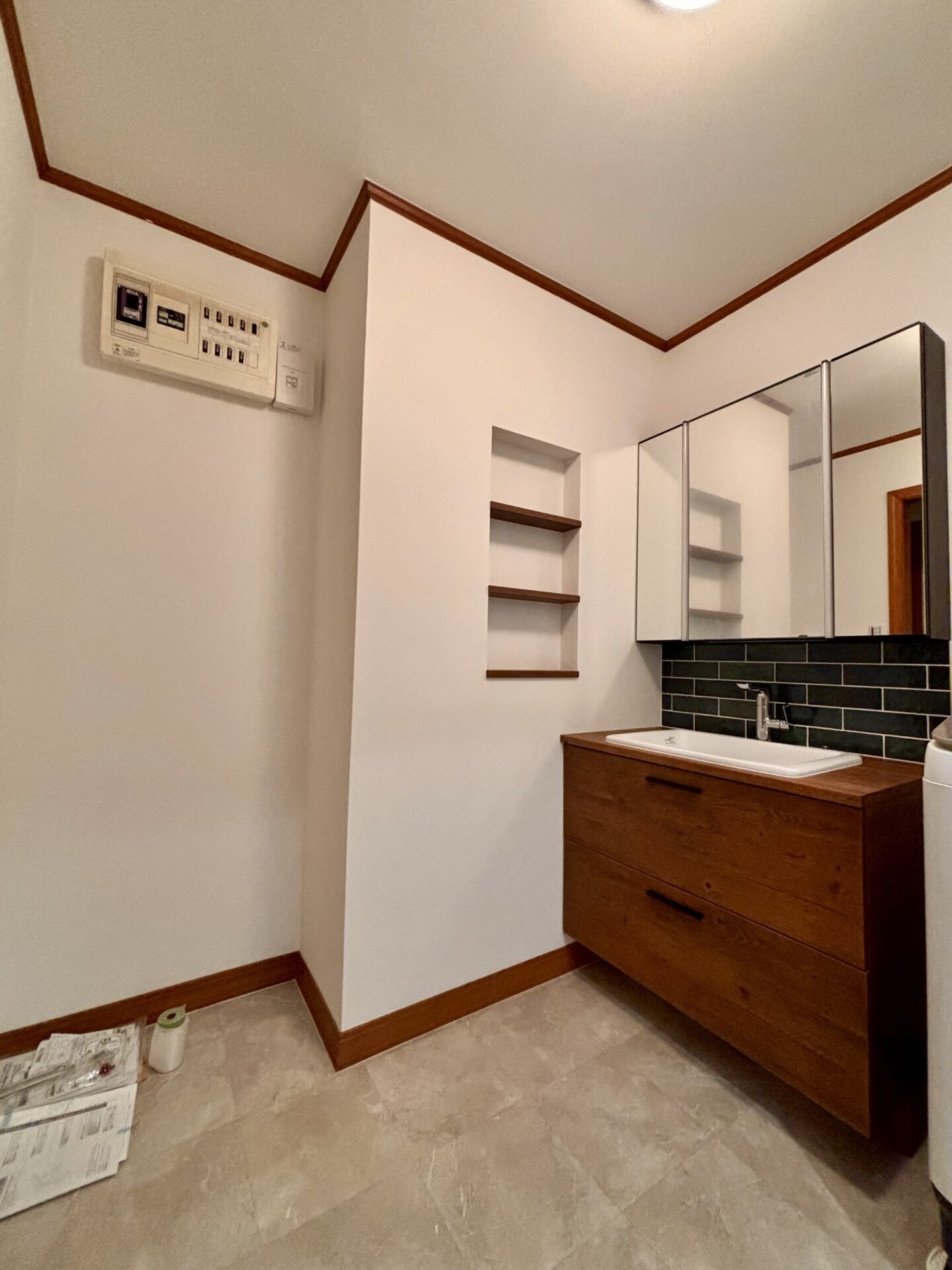 また、「洗面台にタイルを貼りたい」というご要望に応え、いくつかサンプルをご用意し、名古屋モザイク(バーガンディ)をお選びいただきました。