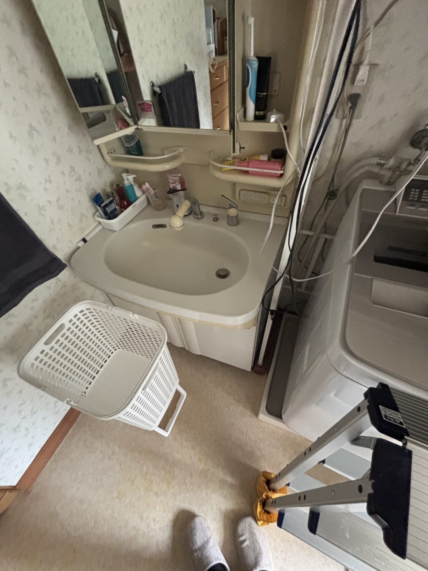 洗面台の下台にはTOTOドレーナ、三面鏡にはLIXILルミシスを組み合わせ。