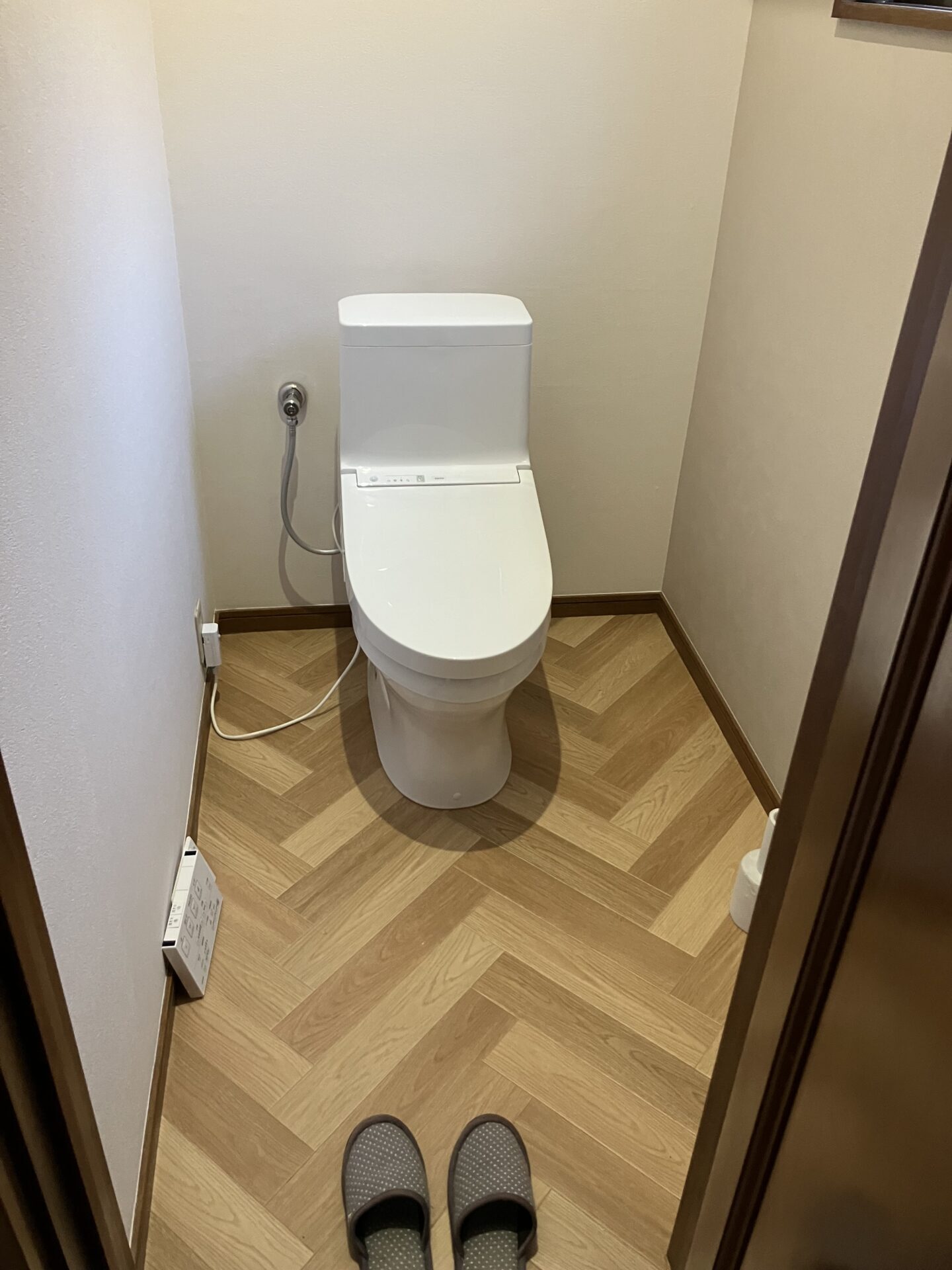 洗面化粧台には「Vシリーズ」、トイレには「ZJ1」を設置しました。トイレは照明と換気扇も一緒に交換し、壁にはアクセントクロスを施すことで、かわいらしく仕上がりました。