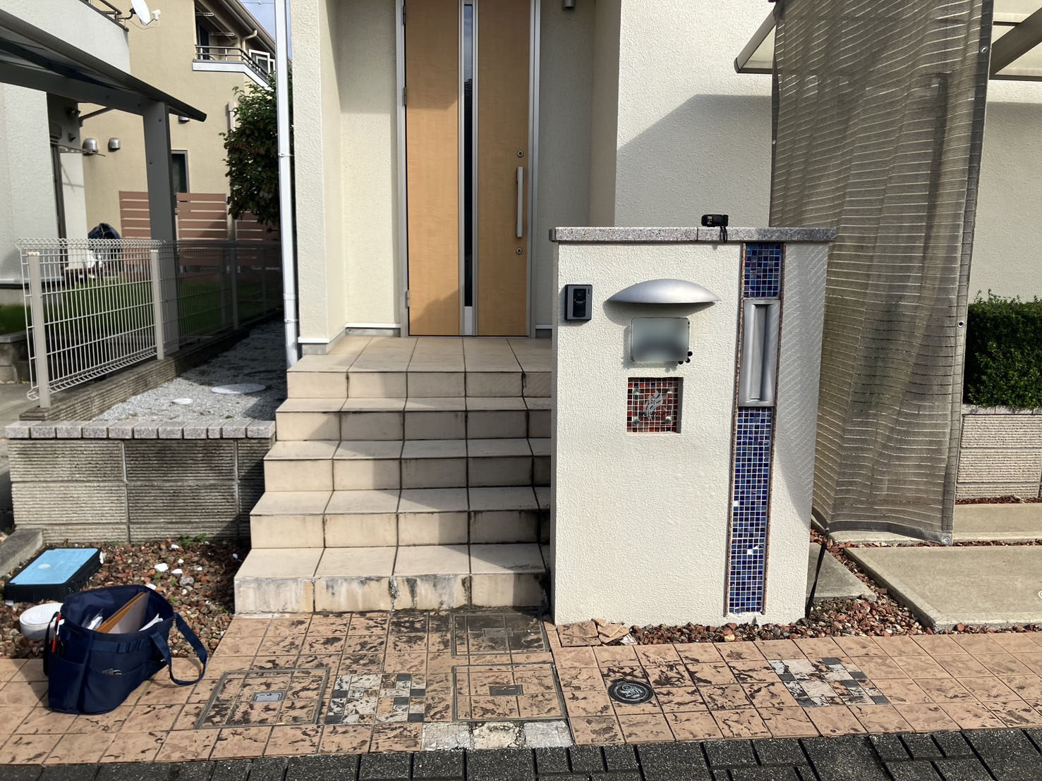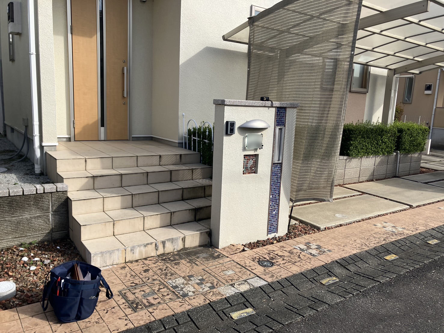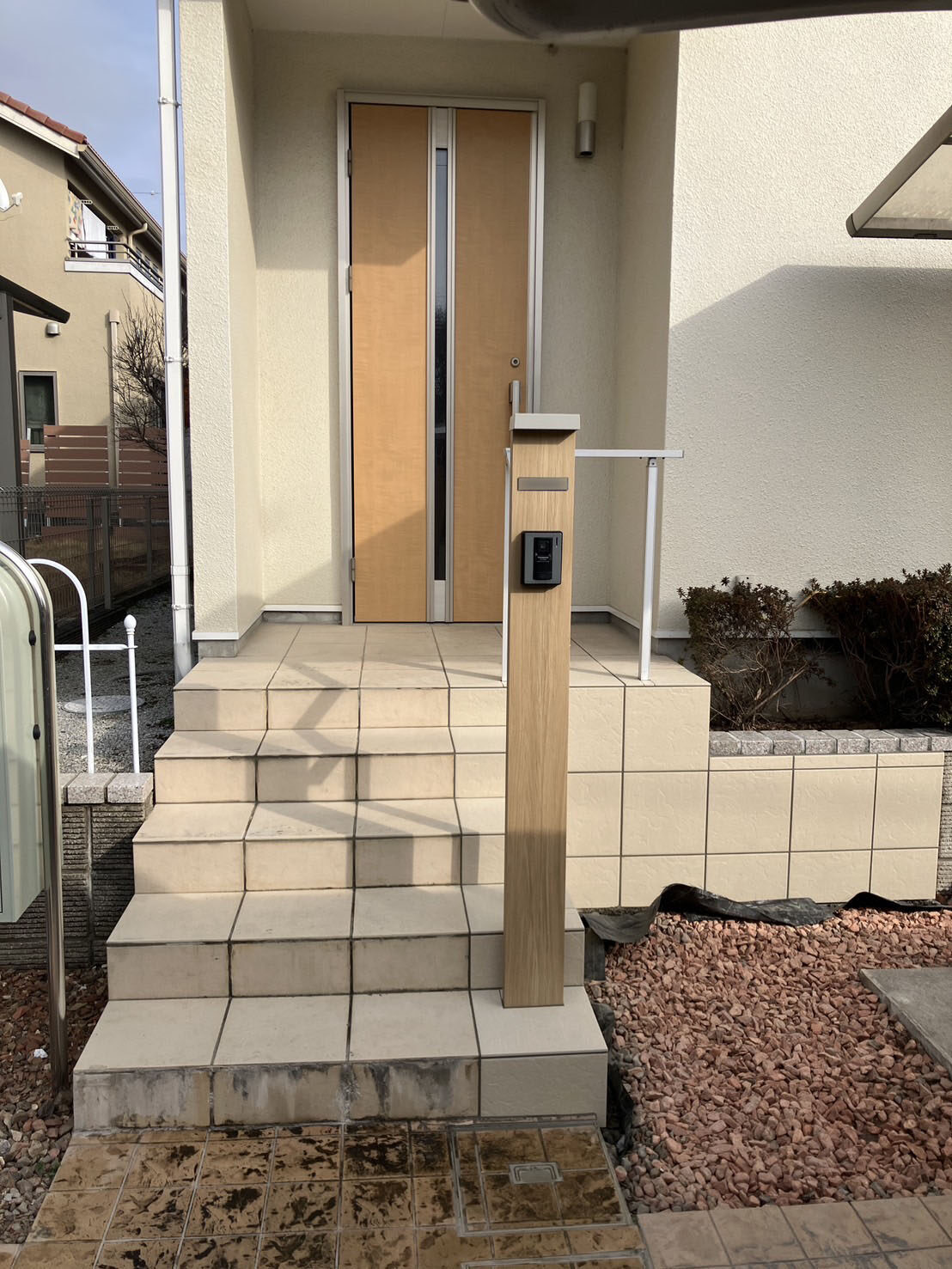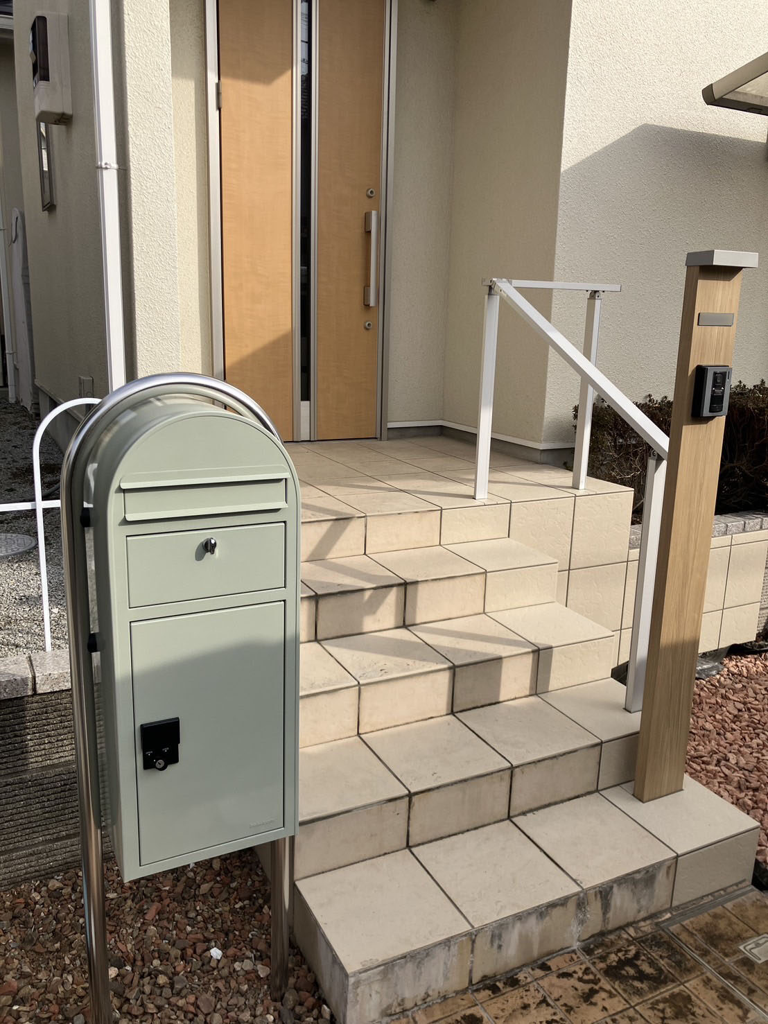 さらに、お打ち合わせを進める中で、「宅配ボックスも付けたい」というご要望をいただき、反対側のスペースに設置させていただきました。受け取りの利便性が向上し、より快適にお使いいただけるエクステリアに仕上がりました。